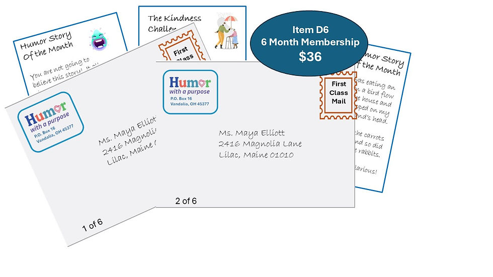 Humor With a Purpose will have you looking forward to checking your mailbox for the next experience. Not only will you enjoy the humorous stories about everyday life, but you'll also be given a monthly kindness challenge suggesting a small act of kindess that will inspire you to make a difference.